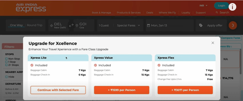 - अब यहां पर आप जिस फ्लाईट से यात्रा करना चाहते है उसका आपको चयन करना होगा,