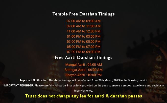 the restriction on Online Booking of Aarti & Darshan Passes Start. Follow the Website or Call the Helpline for further updates.