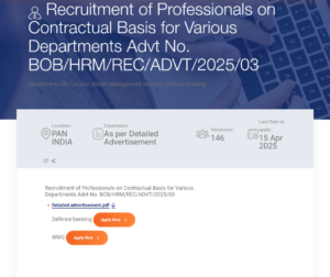 Bank of Baroda ने मार्च 2025 में एक नोटिफिकेशन जारी किया है, जिसमें SO Recruitment 2025 से संबंधित जानकारी दी गई है। इस नोटिफिकेशन में बताया गया है कि Officer Level के विभिन्न पदों पर भर्ती की जाएगी, जो Contractual आधार पर होगी। इस भर्ती के तहत कुल 146 पदों पर Vacancy निकाली गई है।
