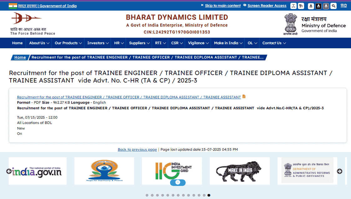 - अब इस पेज पर आने के बाद आपको Recruitment for the post of TRAINEE ENGINEER / TRAINEE OFFICER / TRAINEE DIPLOMA ASSISTANT / TRAINEE ASSISTANT vide Advt. No. C-HR (TA & CP) / 2025-3 के आगे ही Apply Now का विकल्प मिलेगा जिस पर आपको क्लिक करना होगा,