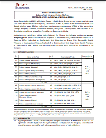 यहां पर आप सभी आवेदको को बता दें कि, बीडीएल ट्रैनी वैकेंसी 2025 के तहत आवेदको की आयु सीमा की गणना 10 अगस्त, 2025 के आधार पर की जाएगी औऱ इसलिए सभी आवेदको की आयु 10 अगस्त, 2025 के दिन ज्यादा से ज्यादा 28 साल होनी चाहिए।
