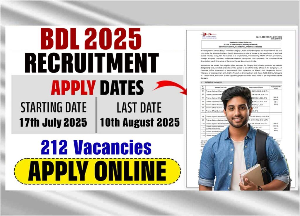 आपकी जानाकरी के लिए आपको बता दें कि, BDL Trainee Engineer / Trainee Diploma Assistant Recruitment 2025 के तहत रिक्त कुल 212 पदों पर भर्तियां की जाएगी जिसके लिए आप सभी योग्य आवेदक आवेदन कर सके इसके लिए आपको आर्टिकल मे विस्तार से Application Fees, Qualification, Age Limit Criteria, Application & Selection Process की की जानकारी प्रदान की जाएगी ताकि आप सुविधापूरी जानकारी प्राप्त करेक इ भर्ती मे आवेदन करके नौकरी प्राप्त कर सकें।