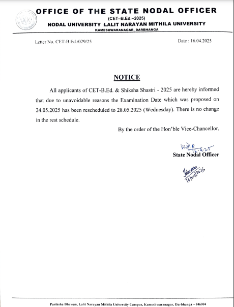 | New Bihar B.Ed Entrance Exam Date | 28th May, 2025 ( Wedneday ) |