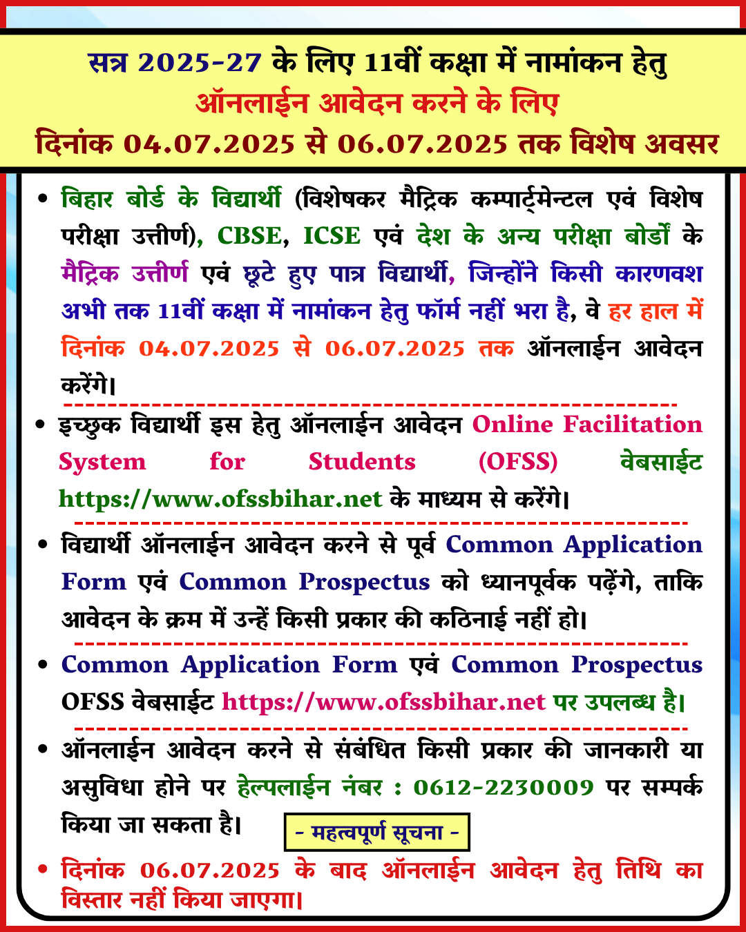 आपको बता दें कि, Bihar 11th Admission 2025 के तहत दाखिला हेतु बिहार बोर्ड ने, आवेदन संबंधी तिथियोें मे विस्तार करते हुए सभी स्टूडेंट्स को 04 जुलाई 2025 से 06 जुलाई 2025 तक ( दाखिला हेतु अप्लाई करने की अन्तिम विस्तारित तिथि ) तक दाखिला हेतु आवेदन करने का सुनहरा अवसर दिया गया है तथा