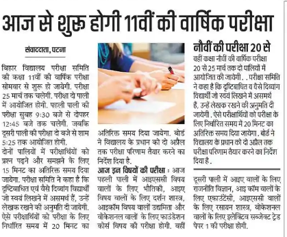 बिहार विद्यालय परीक्षा समिति पटना के द्वारा कक्षा 11वीं की परीक्षा सम्पन्न होने के बाद अब कक्षा 12वीं में दाखिला की प्रकिया शुरू किया जाएगा। आपको बता दूं… बिहार के सभी 10+2 विद्यालय में कक्षा 11वीं की वार्षिक परीक्षा दिनांक 17 मार्च 2025 से 25 मार्च 2025 तक दो पालियों में आयोजित की जा रहीं हैं। प्रथम पाली की परीक्षा सुबह 9:30 बजे से 12:45 तक चलेगी वहीं द्वितीय पाली की परीक्षा दोपहर 02:00 बजे से शाम 05:15 तक चलेगी।