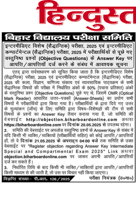 | Bihar Board 12th Compartmental Answer Key 2025 पर आपत्ति दर्ज करने की प्रक्रिया को शुरु किया गया | 20 मई, 2025 |