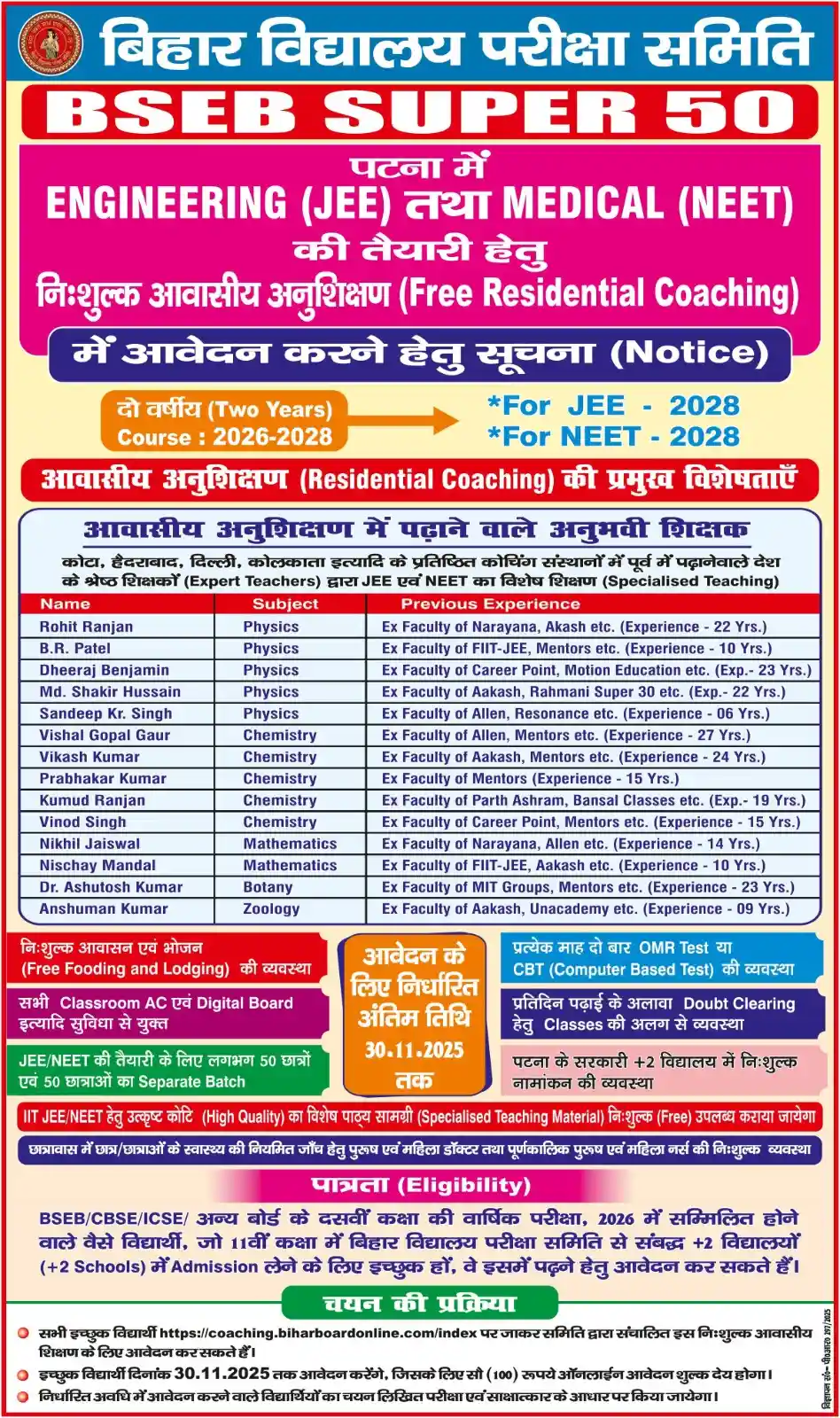 वो सभी छात्र जो 2026 में 10वीं की परीक्षा दे रहे हैं और 11वीं में BSEB बोर्ड से +2 के स्कूल में एडमिशन लेना चाहते हैं, वे सभी छात्र इसके लिए आवेदन कर सकते हैं। आपको बता दें कि BSEB ने हालहि में इस फ्री कोचिंग 2026-28 की नोटिफिकेशन जारी की है। यह कोचिंग छात्रों को JEE और NEET की तैयारी के लिए पढ़ाई करवाएगी। नॉन-रेजिडेंशियल में 9 जिलों (पटना, मुजफ्फरपुर, छपरा, दरभंगा, सहरसा, पूर्णिया, भागलपुर, गया, मुंगेर) में घर के पास फ्री क्लासेस लगेगी, और सुपर 50 जो कि पटना में है उसमे आपको फ्री में रहना और खाना मिलेगा।