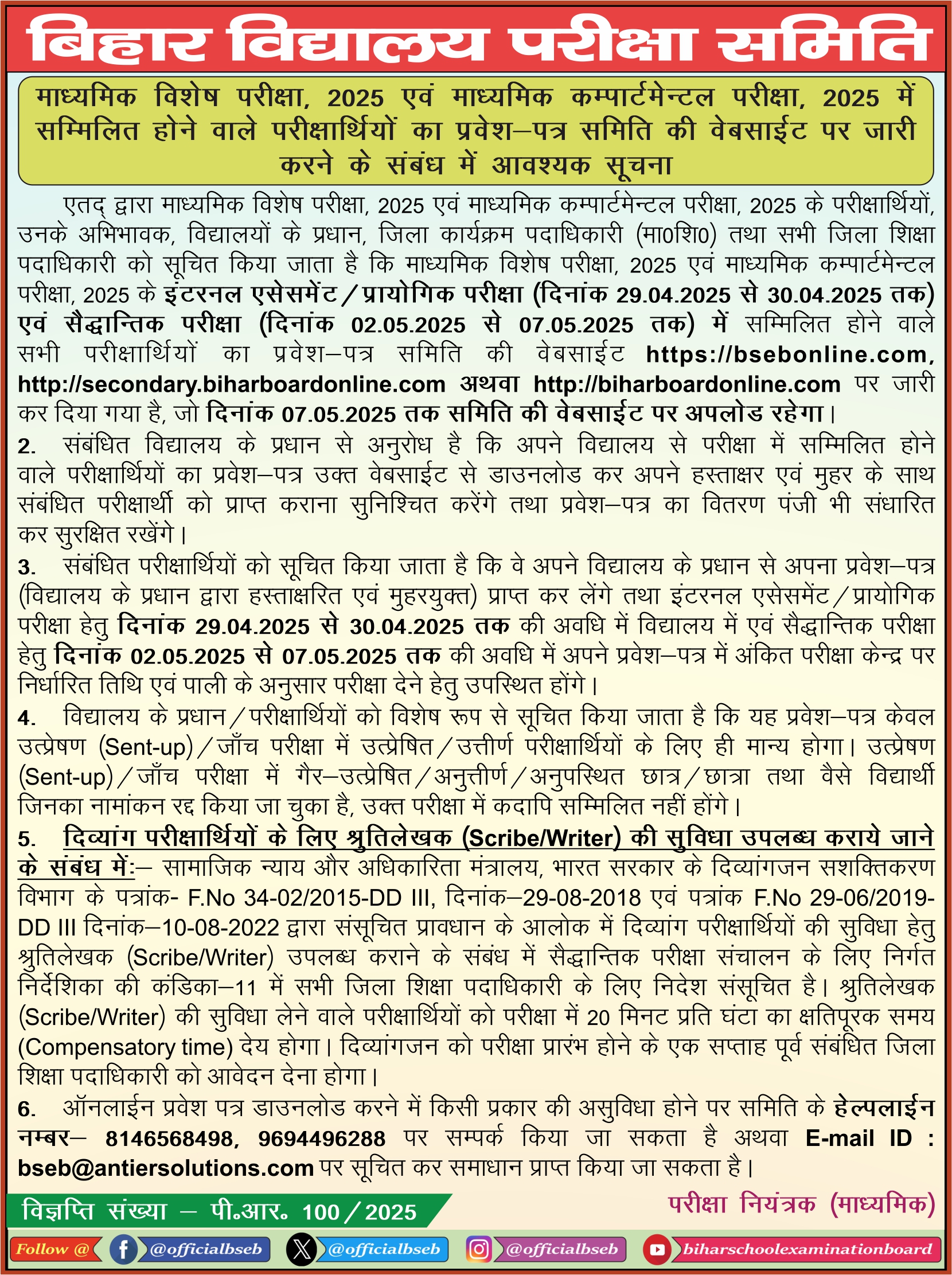 बिहार बोर्ड की आधिकारिक वेबसाइट https://bsebonline.com पर दिनांक 22 अप्रैल 2025 से 02 मई 2025 तक सभी विद्यार्थियों के प्रवेश पत्र उपलब्ध रहेंगे। सभी स्कूल/कॉलेज प्रधान को निर्देश दिया गया है कि वे अपने संस्थान से संबंधित विद्यार्थियों के प्रवेश पत्र को निर्धारित समय सीमा के भीतर डाउनलोड कर लें।
