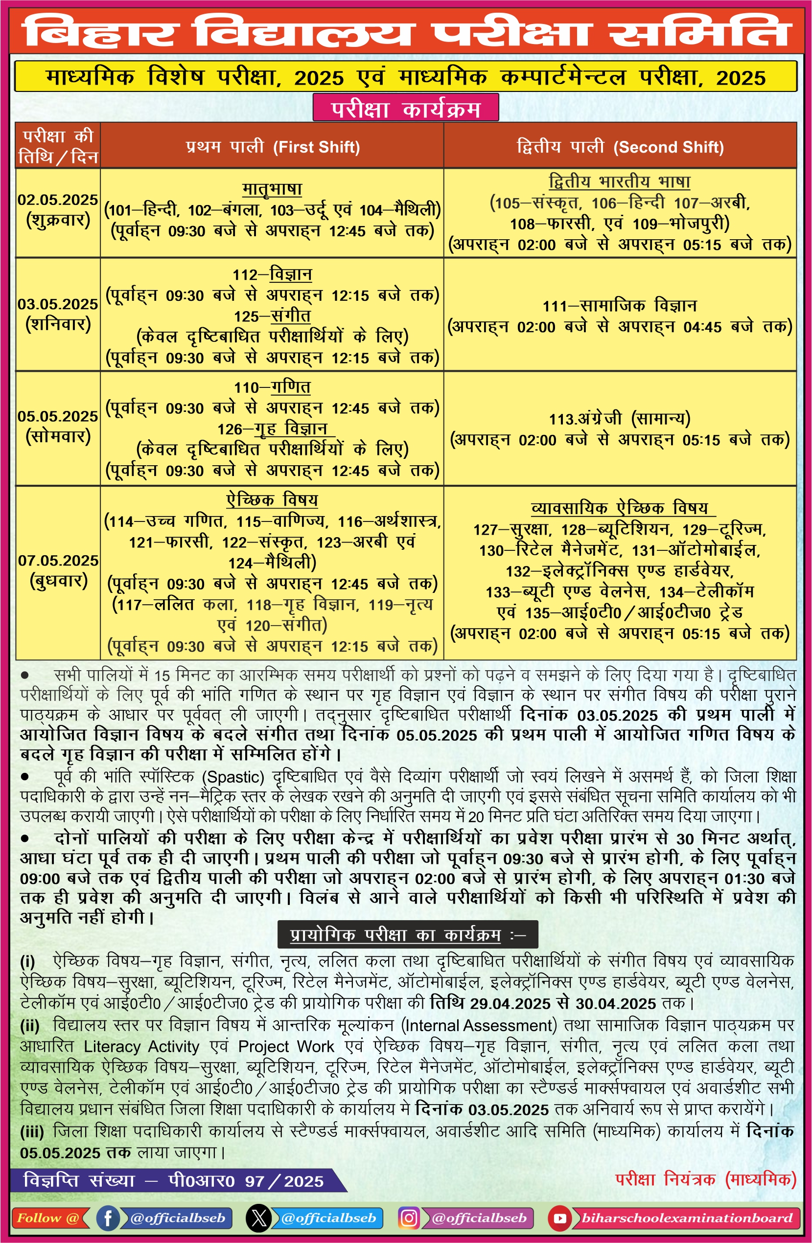 - मैट्रिक व विशेष कंपार्टमेंटल परीक्षा: यह 02 मई 2025 से 07 मई 2025 तक आयोजित की जाएगी।