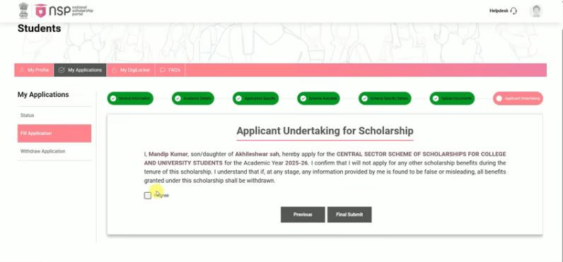- अब यहां पर आपको Agree के चेकबॉक्स को टिक करके Final Submit के ऑप्शन पर क्लिक करना होगा,