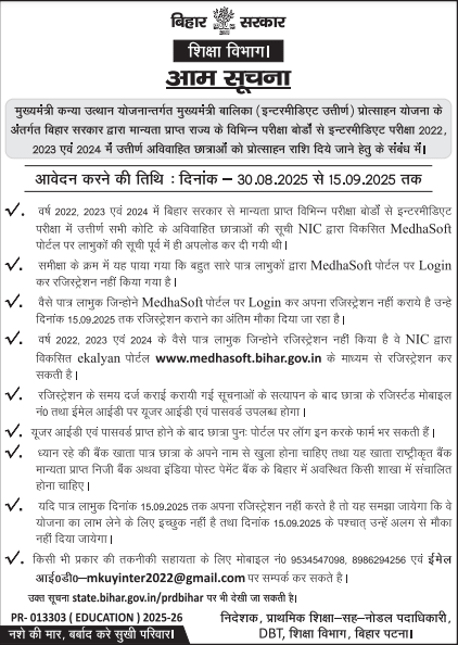 Bihar Mukhyamantri Kanya Utthan Yojana 2025मुख्यमंत्री बालिका प्रोत्साहन योजना (माध्यमिक +2) |
