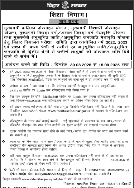 - वैसे सभी पात्र लाभुक जिन्होंने Medha Soft पर Login करके रजिस्ट्रैशन नहीं करवाया है उन्हें 15 सितम्बर, 2025 तक रजिस्ट्रैशन करने का अन्तिम समय दिया गया है,