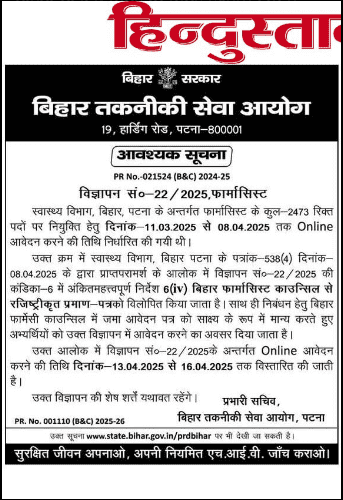 यहां पर हम, आपको बता देना चाहते है कि, बिहार तकनीकी सेवा आयोग द्धारा BTSC Pharmacist Vacancy 2025 के तहत रिक्त कुल 2,473 पदों पर नई भर्ती की जायेगी जिसके लिए ऑनलाइन आवेदन प्रक्रिया को 11 मार्च, 2025 से शुरु किया जायेगा जिसमे आप सभी आवेदक 16 अप्रैल, 2025 ( ऑनलाइन अप्लाई करने हेतु विस्तारित अन्तिम तिथि ) तक अप्लाई कर सकते है और करियर बनाने का सुनहरा अवसर प्राप्त कर सकते है।