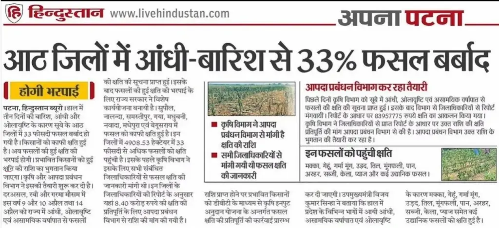 - यहां पर हम, आपको बता देना चाहते है कि, हाल मे ही 3 दिन लगातार आंधी और बारिश के कारण सूबे के कुल 14 जिलोें मे पूरे 33% फसल बर्बाद हो चुकी है जिसकी वजह से किसानोें को बेहद क्षति हुई है और जल्द ही योजना की मदद से मुआवजा देकर किसानोें की क्षतिपूर्ति का प्रयास किया जाएगा।