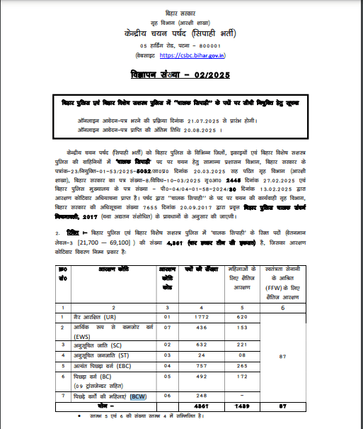 | Official Advertisement of Bihar Police Constable Driver Vacancy 2025 | Download Now |