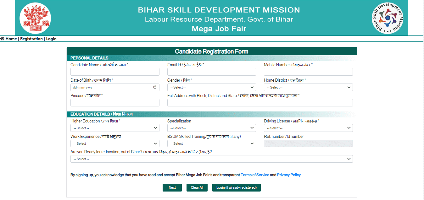 - Bihar Rojgar Mela Online Registration 2025 करने के लिए सबसे पहले आपको इसकी Official Website के होम – पेज पर आना होगा जो कि, इस प्रकार का होगा –