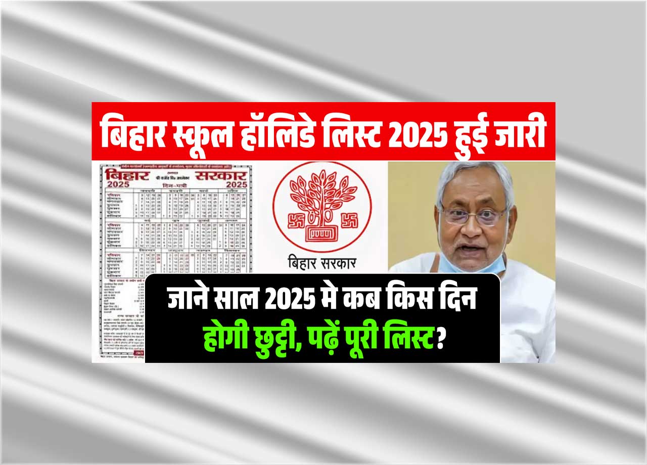 - बिहार राज्य के स्कूलो मे पढ़ने वाले सभी छात्र – छात्राओं के लिए खुशखबरी है कि, शिक्षा विभाग, बिहार सरकार द्धारा साल 2025 हेतु अवकाश लिस्ट / हॉलिडे लिस्ट अर्थात् Bihar School Holidays 2025 को जारी कर दिया गया है जिसको लेकर हमने रिपोर्ट तैयार किया है जिसकी पूरी विस्तृत जानकारी आपको इस आर्टिकल मे प्रदान की जाएगी जिसके लिए आपको अन्त तक हमारे साथ बने रहना होगा।