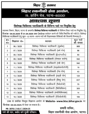 बीटीएससी ने निकाली स्पेशलिस्ट मेडिकल ऑफिशर्स की नई भर्ती जारी, जाने क्या है पूरी भर्ती, आवेदन प्रक्रिया और अप्लाई करने की लास्ट डेट – Bihar Specialist Medical Officer Vacancy 2025?