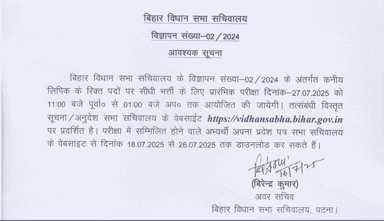 | Direct Link To Downlaod Bihar Vidhan Sabha Junior Clerk Exam Date Notice 2025 | Download Now |