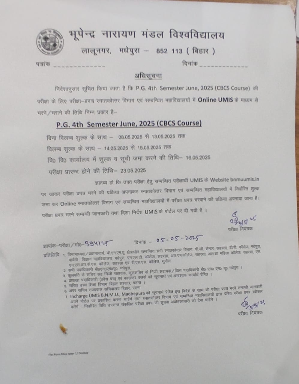 दोस्तों, भूपेन्द्र नारायण मंडल विश्वविद्यालय (BNMU), मधेपुरा ने स्नातकोत्तर (PG) चौथे सेमेस्टर (CBCS) जून 2025 परीक्षा हेतु ऑनलाइन फॉर्म भरने की तिथि जारी कर दी है। सत्र 2023-25 के छात्र 08 मई से 13 मई 2025 तक बिना विलंब शुल्क के फॉर्म भर सकते हैं। विलंब शुल्क के साथ अंतिम तिथि 15 मई 2025 है। सभी आवेदन UMIS पोर्टल bnmuumis.in के माध्यम से ऑनलाइन भरे जाएंगे। परीक्षा 23 मई 2025 से शुरू होगी। सभी छात्र समय रहते आवेदन करें और आवेदन की प्रिंट कॉपी अपने पास सुरक्षित रखें। इसका अधिकारिक नोटिस आप नीचे देख सकते हैं –