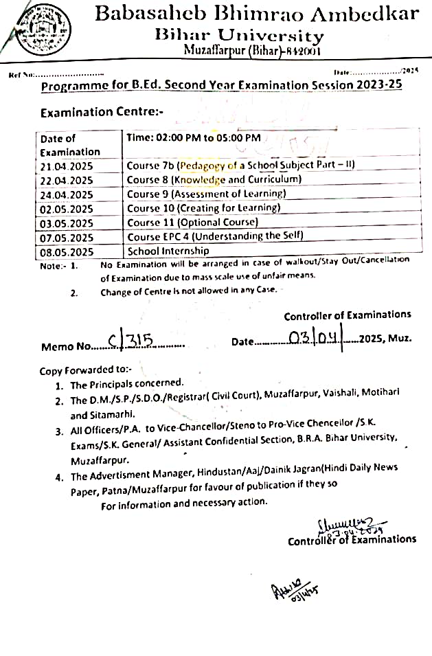 नमस्कार दोस्तों, बाबासाहेब भीमराव अंबेडकर बिहार यूनिवर्सिटी, मुजफ्फरपुर से शैक्षणिक सत्र 2023-25 से बीएड करने वाले सभी विद्यार्थियों का द्वितीय वर्ष के परीक्षा का कार्यक्रम जारी कर दिया गया हैं। परीक्षा रूटीन के अनुसार परीक्षा की शुरुआत 21 अप्रैल 2025 से होगी। वही अंतिम परीक्षा दिनांक 08 मई 2025 को होगी। परीक्षा द्वितीय पाली में आयोजित होगी। परीक्षा की शुरुआत दोपहर 2 बजे से शाम 5 बजे तक होगी। परीक्षा का रूटीन सभी विद्यार्थी नीचे दिए गए नोटिस के माध्यम से देख सकते हैं –