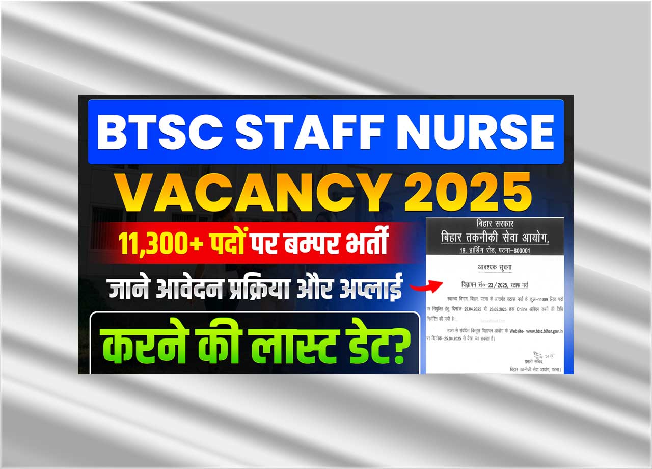 BTSC Staff Nurse Vacancy 2025: क्या आप भी स्वास्थ्य विभाग, बिहार सरकार के तहत स्टॉफ नर्स के पद पर सरकारी नौकरी प्राप्त करना चाहते है तो आपके लिए बिहार तकनीकी सेवा आयोग द्धारा 11,300+ पदोे पर स्टॉफ नर्स की बम्पर भर्ती को जारी किया गाय है जो कि, आपके लिए स्टॉफ नर्स के पद पर सरकारी नौकरी पाने का सुनहरा अवसर साबित हो सकता है और इसीलिए हम, आपको इस आर्टिकल मे विस्तार से BTSC Staff Nurse Vacancy 2025 Notification के बारे मे बतायेगे जिसके लिए आपको धैर्यपूर्वक इस आर्टिकल को पढ़ना होगा ताकि आप पूरी – पूरी जानकारी प्राप्त कर सकें।