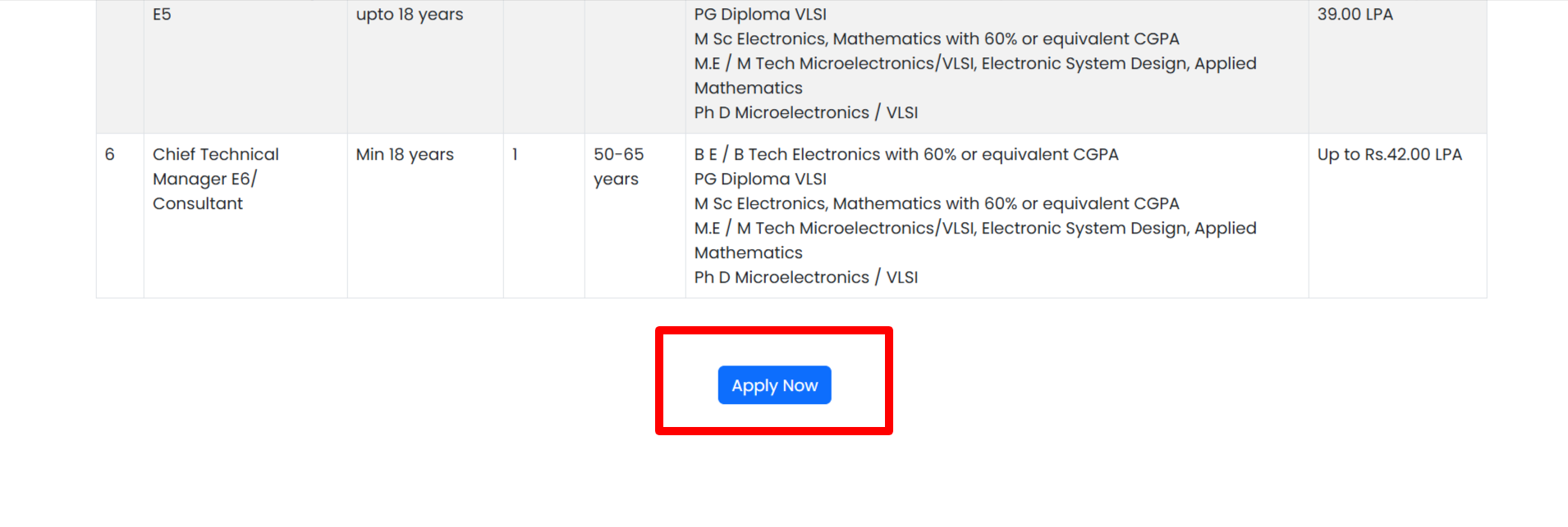 | Principal Design Engineer (E3) | B.E./B.Tech (Electronics) OR M.Sc. (Electronics/Maths); PG Diploma / M.Tech / Ph.D. in VLSI, Microelectronics, etc. |