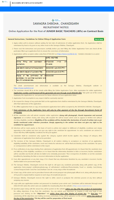 प्रत्येक आवैेदक व उम्मीदवार Chandigarh JBT Teacher Recruitment 2025 मे 07 अगस्त, 2025 से लेकर 28 अगस्त, 2025 तक ऑनलाइन आवेदन कर सकते है और 30 अगस्त, 2025 आवेदन शुल्क भुगतान कर सकते है।
