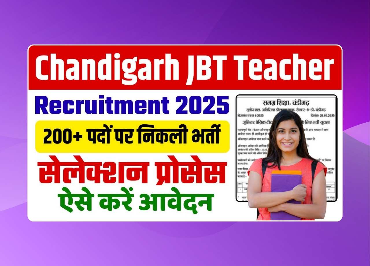 Chandigarh JBT Teacher Recruitment 2025: यदि आप भी जूनियर बेसिक टीचर ( जेबीटी ) के पद पर सरकारी नौकरी प्राप्त करना चाहते है तो आपके लिए अच्छी खबर है कि, Chandigarh Education Department द्धारा Junior Basic Teacher (JBT) के रिक्त 200+ पदों पर भर्ती नोटिफिकेशन जारी किया गया है जिसमे अप्लाई करके आप नौकरी प्राप्त कर सकते है और इसीलिए आर्टिकल मे आपको विस्तार से Chandigarh JBT Teacher Recruitment 2025 के बारे मे बतायेगें जिसके लिए आपको अन्त तक इस लेख को पढ़ना होगा।