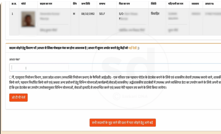 - अब यहां पर आप परिवार के अन्य सदस्यों का नाम जोड़ने हेतु आपको उनक आधार कार्ड नंबर को दर्ज करना होगा और उनके आधार कार्ड से लिंक्ड मोेबाइल नंबर पर मिले ओ.टी.पी को दर्ज करके ” वेरिफाई करें “ के विकल्प पर क्लिक करना होगा,