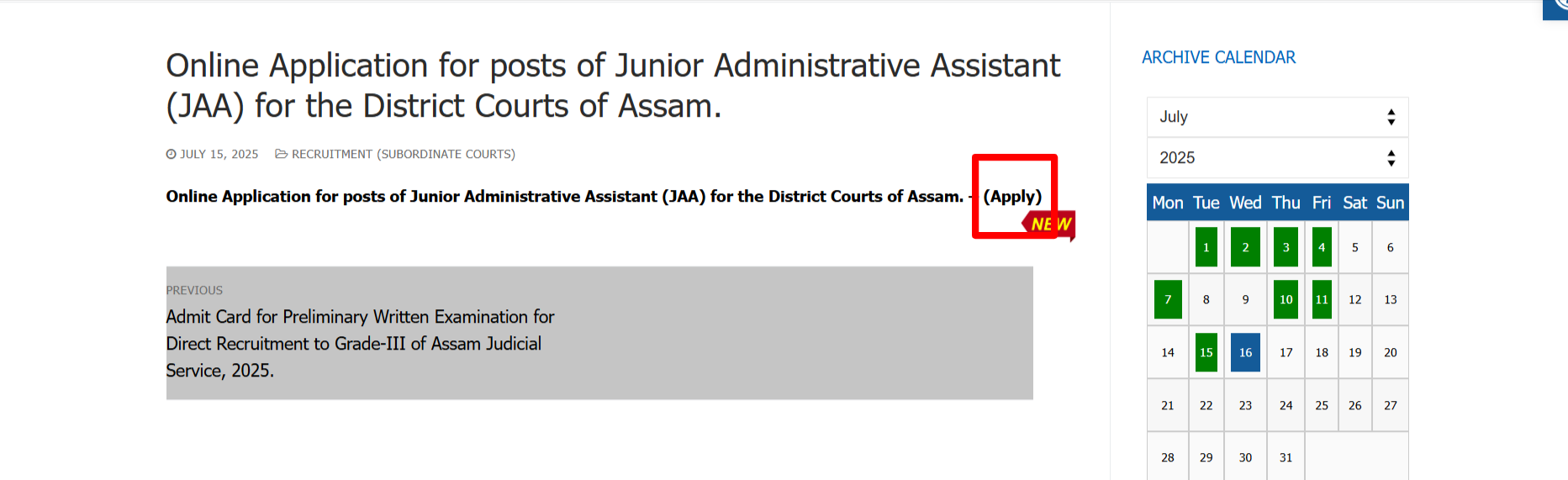 - यहाँ पर Online Application for posts of Junior Administrative Assistant (JAA) for the District Courts of Assam. के सामने दिये गए Apply के ऑप्शन पर क्लिक करें।