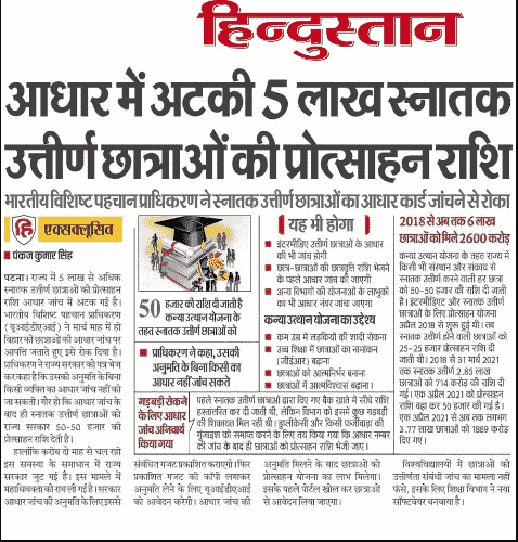 - साथ ही साथ हम, आपको बता देना चाहते है कि, राज्य मे 5 लाख से अधिक स्नातक उत्तीर्ण छात्राओं की प्रोत्साहन राशि, आधार कार्ड की प्रक्रिया ठप्प होने की वजह से रुकी हुई है और आधार जांच की प्रक्रिया के ठप्प होने का प्रमुख कारण है कि, भारतीय विशिष्ट पहचान प्राधिकरण ( UIDAI ) द्धारा मार्च मे ही बिहार की छात्राओं के आधार जांच पर आपत्ति जताते हुए आधार जांच की प्रक्रिया को तत्काल प्रभाव से रोक दिया गया है।