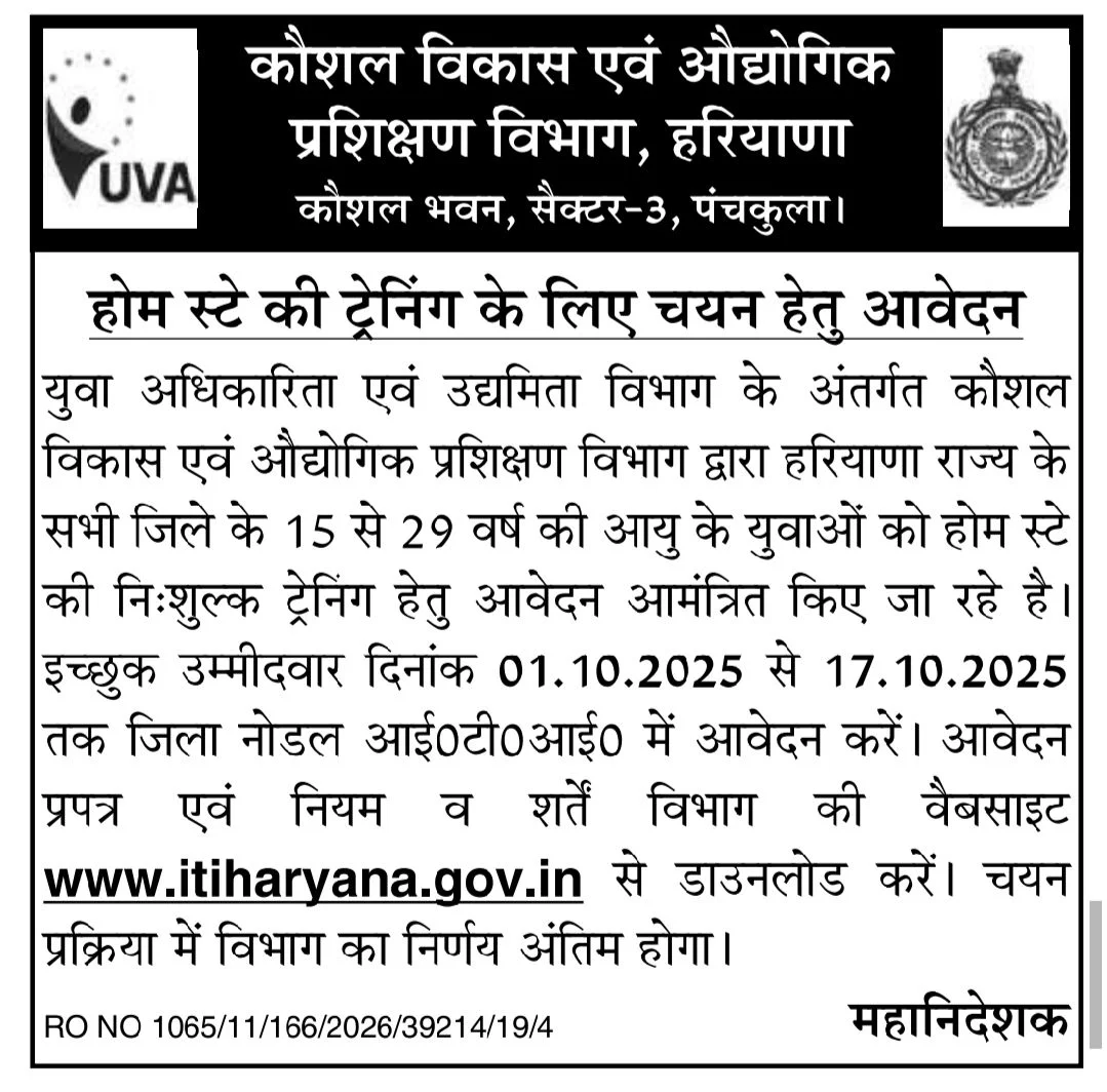 अगर आप भी 10वीं पास है और 10वीं के बाद ऐसा कोर्स ढूढ़ रहे हैं जो फ्री हो और आपको जल्दी से रोजगार दिला दे। तो आप सही आर्टिकल पढ़ रहे हैं। Skill Development and Industrial Training Department, Haryana ने हालही में एक नोटिफिकेशन जारी किया है। जिसमे युवाओं को होम स्टे ट्रेनिंग के जरिए आत्मनिर्भर बनाने के लिए भर्ती निकाली है। यह नोटिफिकेशन 1 अक्टूबर 2025 को जारी हुई थी।