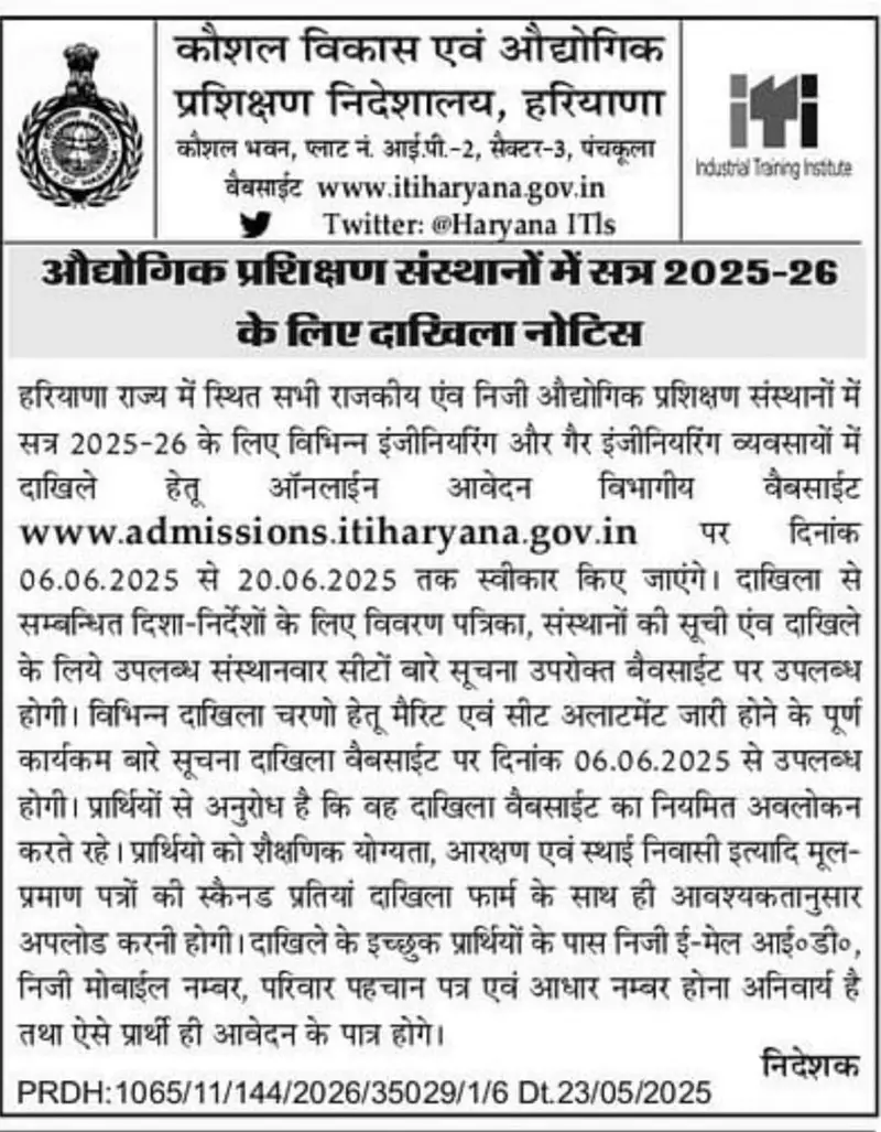 | Haryana ITI Admission 2025 Start Date | 06, June 2025 |