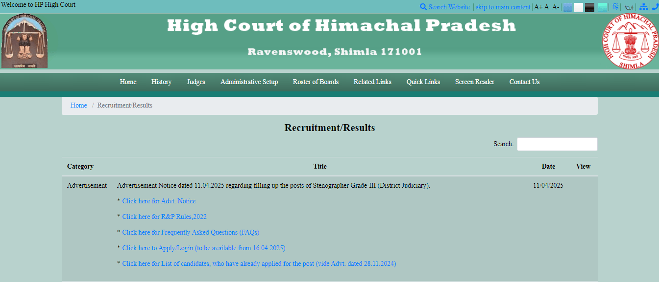 | Direct Link to Apply Online In HP High Court Shimla Recruitment 2025 | Click here to Apply / Login (to be available from 16.04.2025) |