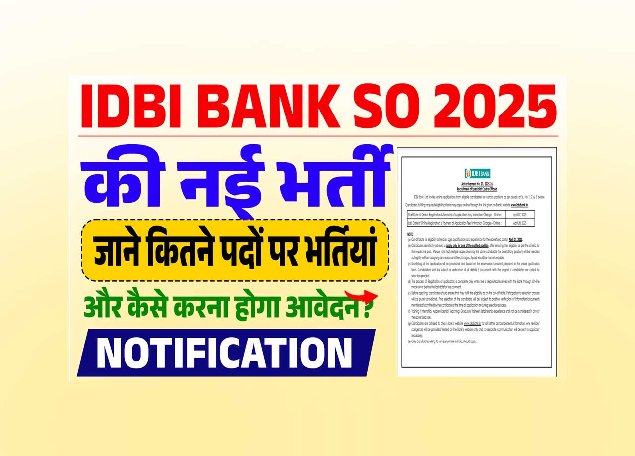 IDBI Bank SO Recruitment 2025: बैकिंग सेक्टर मे करियर बनाने का सपना देखने वालोें की IDBI Bank द्धारा नया भर्ती नोटिफिकेशन जारी किया गया है जिसके तहत स्पेशलिस्ट ऑफिशर्स / Specialist Cadre Officers के रिक्त पदोें पर भर्ती की जानी है जो कि, आपके लिए बैकिंग सेक्टर मे करियर बनाने का सुनहरा अवसर साबित हो सकता है और इसीलिए हम, आपको विस्तार से इस आर्टिकल मे IDBI Bank SO Recruitment 2025 के बारे मे बतायेगें जिसके लिए आपको धैर्यपूर्वक इस आर्टिलक को पढ़ना होगा ताकि आप पूरी – पूरी जानकारी प्राप्त कर सकें।