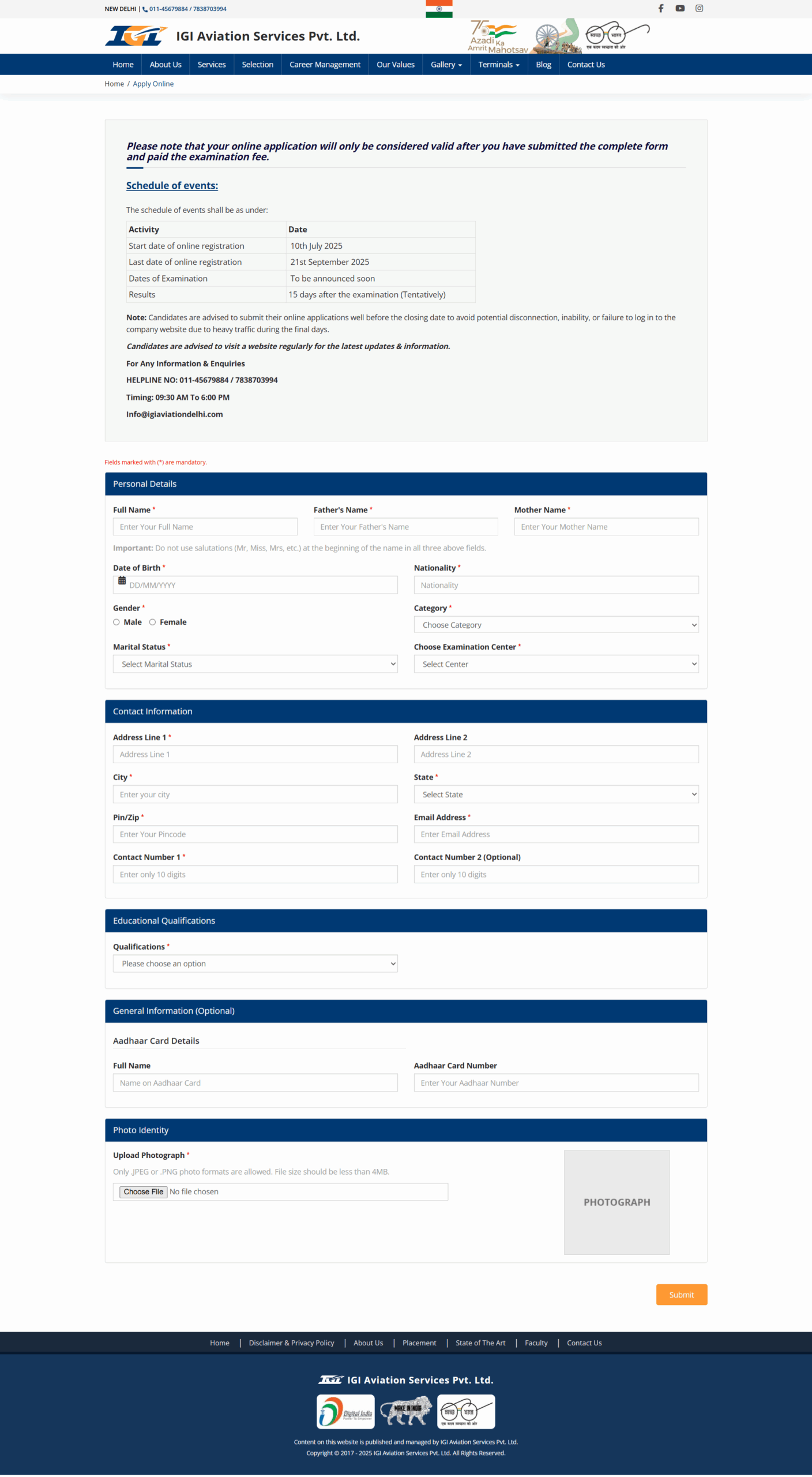 जो भी इच्छुक उम्मीदवार IGI Aviation भर्ती 2025 के तहत अपना ऑनलाइन आवेदन करना चाहते हैं, वे 10 जुलाई 2025 से 21 सितंबर 2025 तक IGI Aviation की आधिकारिक वेबसाइट igiaviationdelhi.com के माध्यम से अपना ऑनलाइन आवेदन कर सकते हैं।