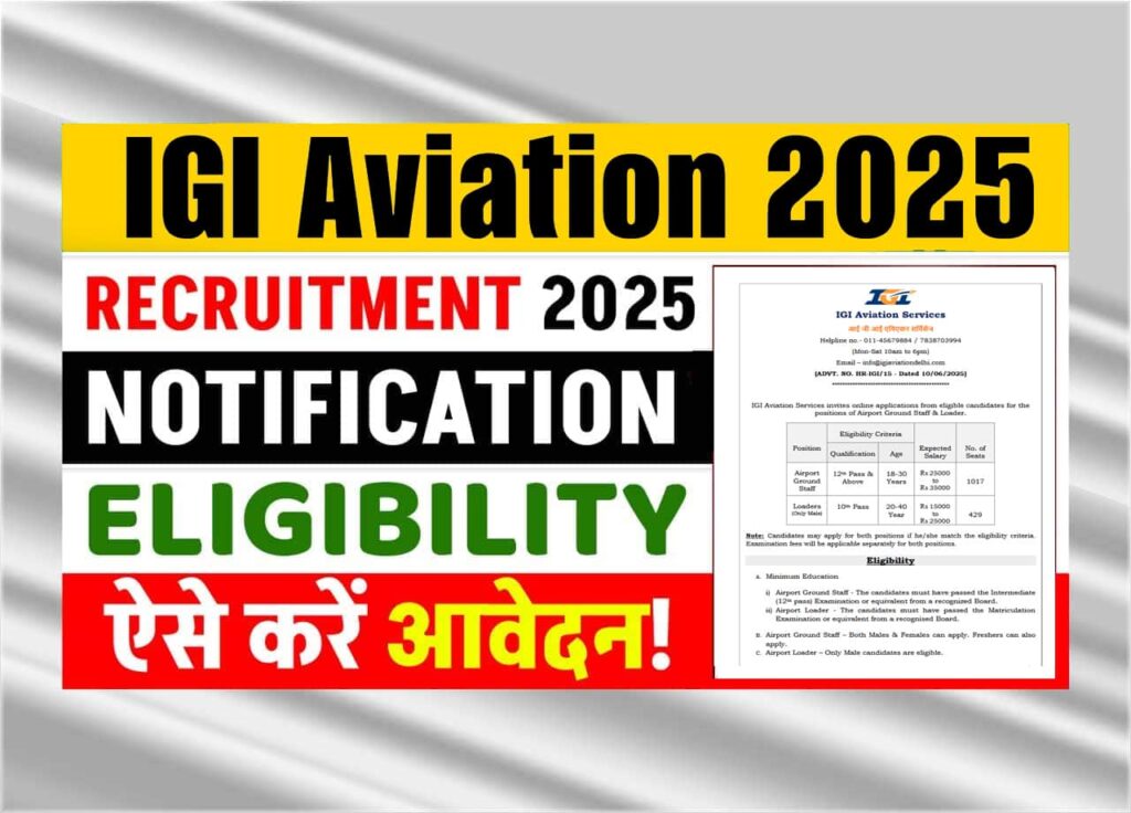 IGI Aviation Recruitment 2025:- IGI एविएशन सर्विसेज द्वारा अभी हाल ही एक नया भर्ती नोटिफ़िकेशन जारी किया है। यह भर्ती नोटिफ़िकेशन हमारे देशभर के उन सभी युवाओं के लिए एक हत्वपूर्ण अवसर है जो एयरपोर्ट के क्षेत्र में अपना करियर बनाना चाहते हैं। IGI एविएशन सर्विसेज द्वारा यह भर्ती दो प्रमुख पदों – एयरपोर्ट ग्राउंड स्टाफ और लोडर के लिए की जा रही है। इस भर्ती के तहत कुल 1146 पदों की रिक्तियाँ निकाली गई हैं जिसमें 1017 पद ग्राउंड स्टाफ के लिए और 429 पद लोडर के लिए निर्धारित किए गए हैं।