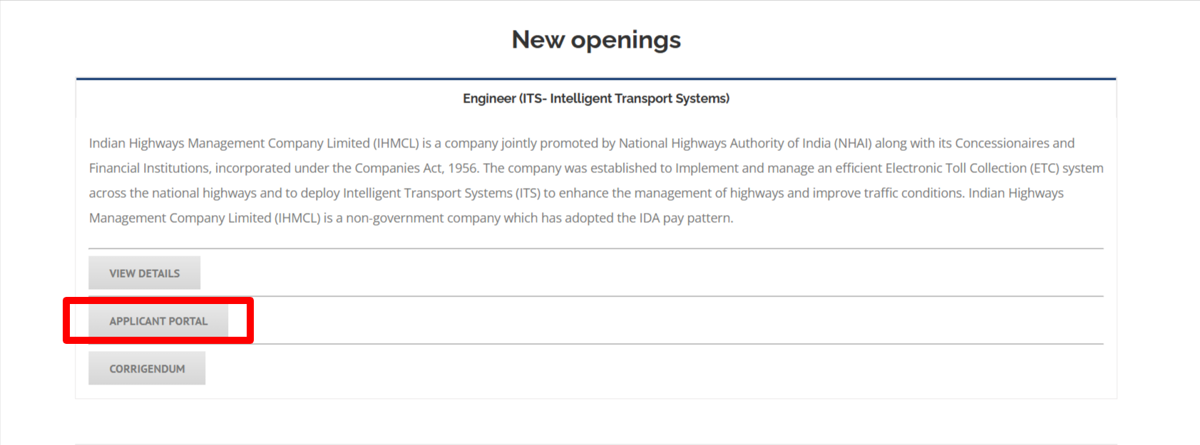 - जिसके बाद आपके सामने कुछ इस तरह का पेज खुलकर आएगा यहाँ पर आपको Engineer (ITS- Intelligent Transport Systems) के सेक्शन में दिये गए Applicant Portal के ऑप्शन पर क्लिक करना है।