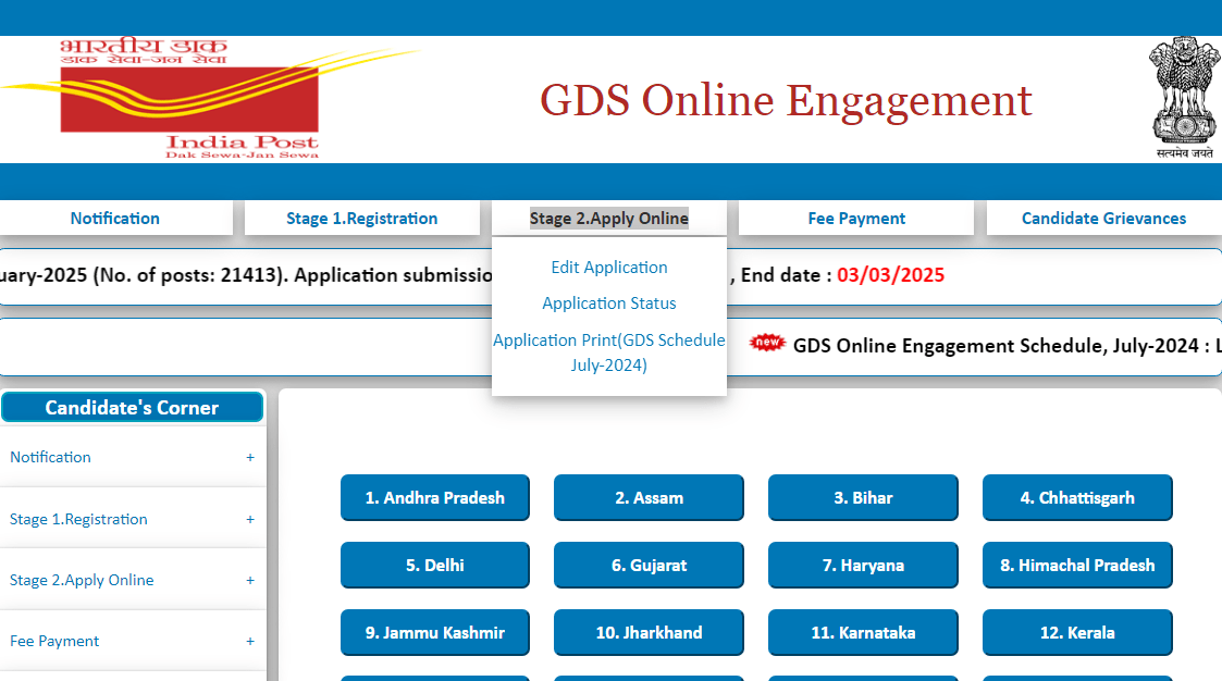 GDS Online Engagement Schedule-I, January-2025 (No. of posts: 21413). Application submission Start date : 10/02/2025 , End date : 03/03/2025Online Apply Dates of India Post Office GDS Recruitment 2025?
