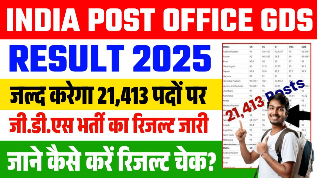 India Post Office GDS Result 2025: क्या आपने भी 21,413 पदों पर ग्राम डाक सेवक भर्ती हेतु जारी इंडिया पोस्ट जीडीएस भर्ती 2025 मे अप्लाई किया है और रिजल्ट / मैरिट लिस्ट के जारी होने का इंतजार कर रहे है तो आपके लिए अच्छी खबर है कि, जल्द ही इंडिया पोस्ट द्धारा India Post Office GDS Result 2025 को जारी कर दिया गया है जिसकी पूरी लाईव अपडेट हम, आपको अपने इस प्लेटफॉर्म के द्धारा लगातार प्रदान करने का प्रयास करेगें जिसके लिए आपको नियमित रुप से हमारे साथ बने रहना होगा।