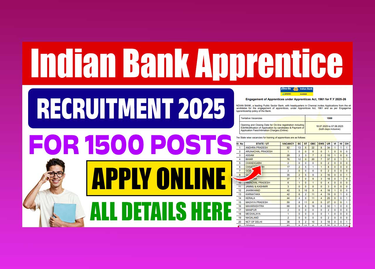 Indian Bank Apprentice Recruitment 2025: क्या आप भी बैंक मे अप्रैंटिस के पद पर नौकरी प्राप्त करना चाहते है तो आपके लिए अच्छा अवसर है कि, इडियन बैंक ने, अपने अलग – अलग राज्यों की शाखाओ के लिए 1,500 पदों पर नई अप्रैंटिस भर्ती को जारी किया है जिसमे सभी इच्छुक व योग्य आवेदक आसानी से 18 जुलाई, 2025 से लेकर 07 अगस्त, 2025 तक आवेदन कर सकते है जिसकी पूरी जानकारी आपको आर्टिकल मे प्रदान की जाएगी।