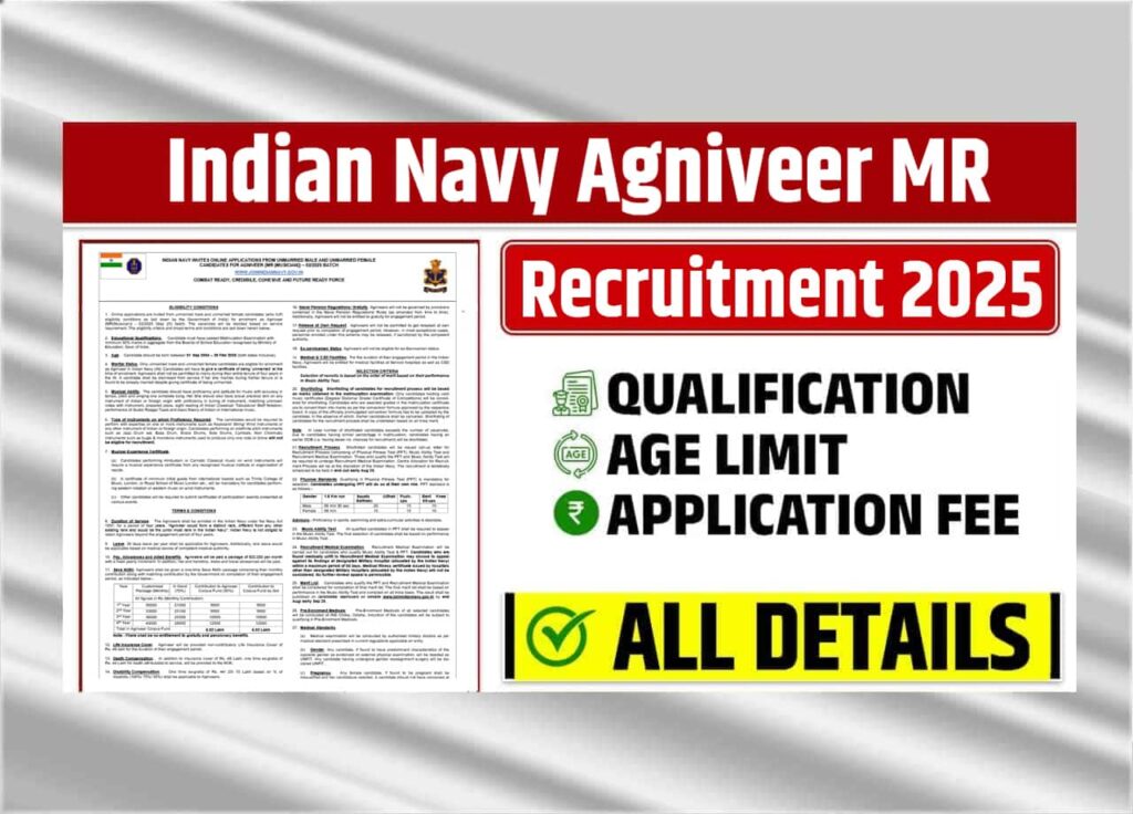 Indian Navy Agniveer MR Recruitment 2025:- भारतीय नौसेना ने अग्निपथ योजना के अंतर्गत अग्निवीर (MR – म्यूज़िशियन) 02/2025 बैच के माध्यम से देश के सभी संगीत में रुचि रखने वाले युवा उम्मीदवारों को एक सुनहरा अवसर प्रदान किया है, जिसमें देश के अविवाहित पुरुष एवं महिला उम्मीदवारों को नौसेना में चार वर्षों तक सेवा देने का मौका मिलेगा, जिससे वे न केवल राष्ट्र की सेवा कर सकेंगे बल्कि सैन्य अनुशासन, समर्पण, नेतृत्व, साहस और सैन्य जीवन के मूल्यों को भी प्राप्त कर सकते हैं।