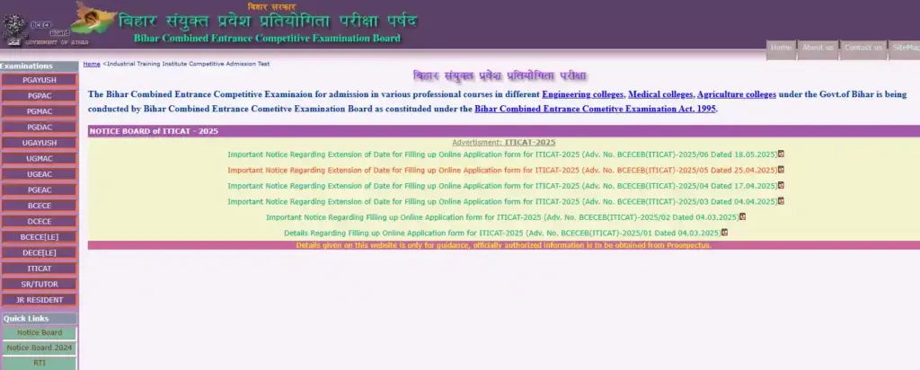 - स्टेप 1: आवेदन पत्र भरें: सबसे पहले आपको अपने राज्य बोर्ड या कॉलेज के अनुसार प्रवेश परीक्षा (जैसे BCECEB – ITICAT) का आवेदन पत्र भरना होगा, अगर एडमिशन मेरिट बेस पर हो रही है, तब भी बोर्ड की वेबसाइट पर आपको आवेदन करना होगा। अगर सीटें ज्यादा हैं और आवेदक कम हैं, तो मेरिट लिस्ट का कटऑफ कम अंक के साथ बन सकती है, जिससे कम अंक वाले छात्रों को भी दाखिला मिल सकता है।