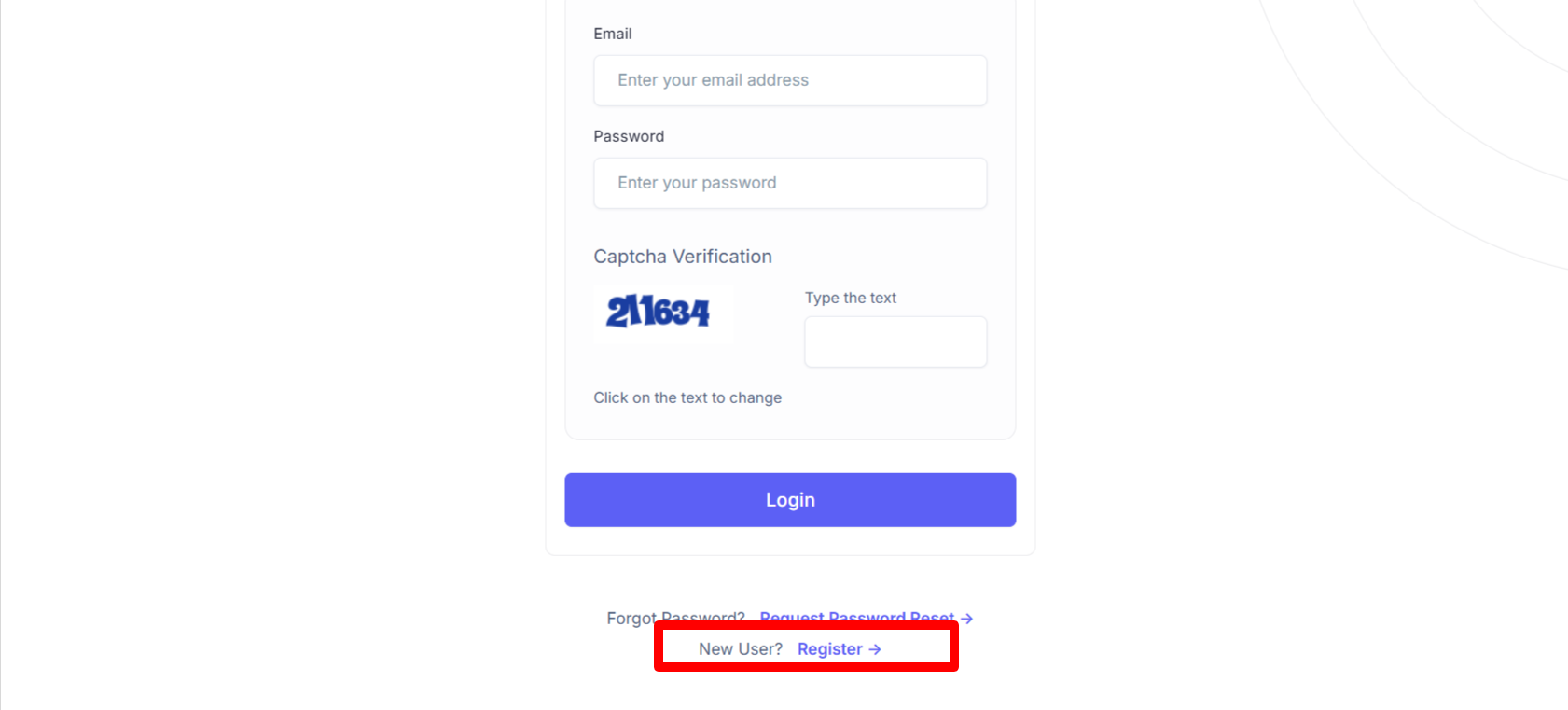 - अब आपके सामने कुछ इस तरह का लॉगिन पेज खुलकर आएगा यहाँ पर आपको नीचे New User? Register → का ऑप्शन मिलेगा आपको इसी ऑप्शन पर क्लिक करना है।