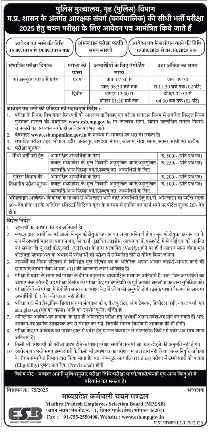 जिन भी उम्मीदवारों ने MP Police Constable का फॉर्म भरा है, उनका हम इस लेख में स्वागत हैं। MPESB ने 13 सितंबर 2025 को भर्ती की नोटिफिकेशन जारी की थी, जिसमें 7500 कांस्टेबल पदों के लिए पूरी जानकारी दी थी। नोटिफिकेशन के अनुसार आवेदन 15 सितंबर 2025 से शुरू हुए थे, लेकिन आवेदन भरने की तिथि कम थी जिसे 29 सितंबर से बढ़ा कर 6 अक्टूबर 2025 कर दिया था और सुधार की तारीख 8 अक्टूबर 2025 तक बढ़ा दी गई थी।