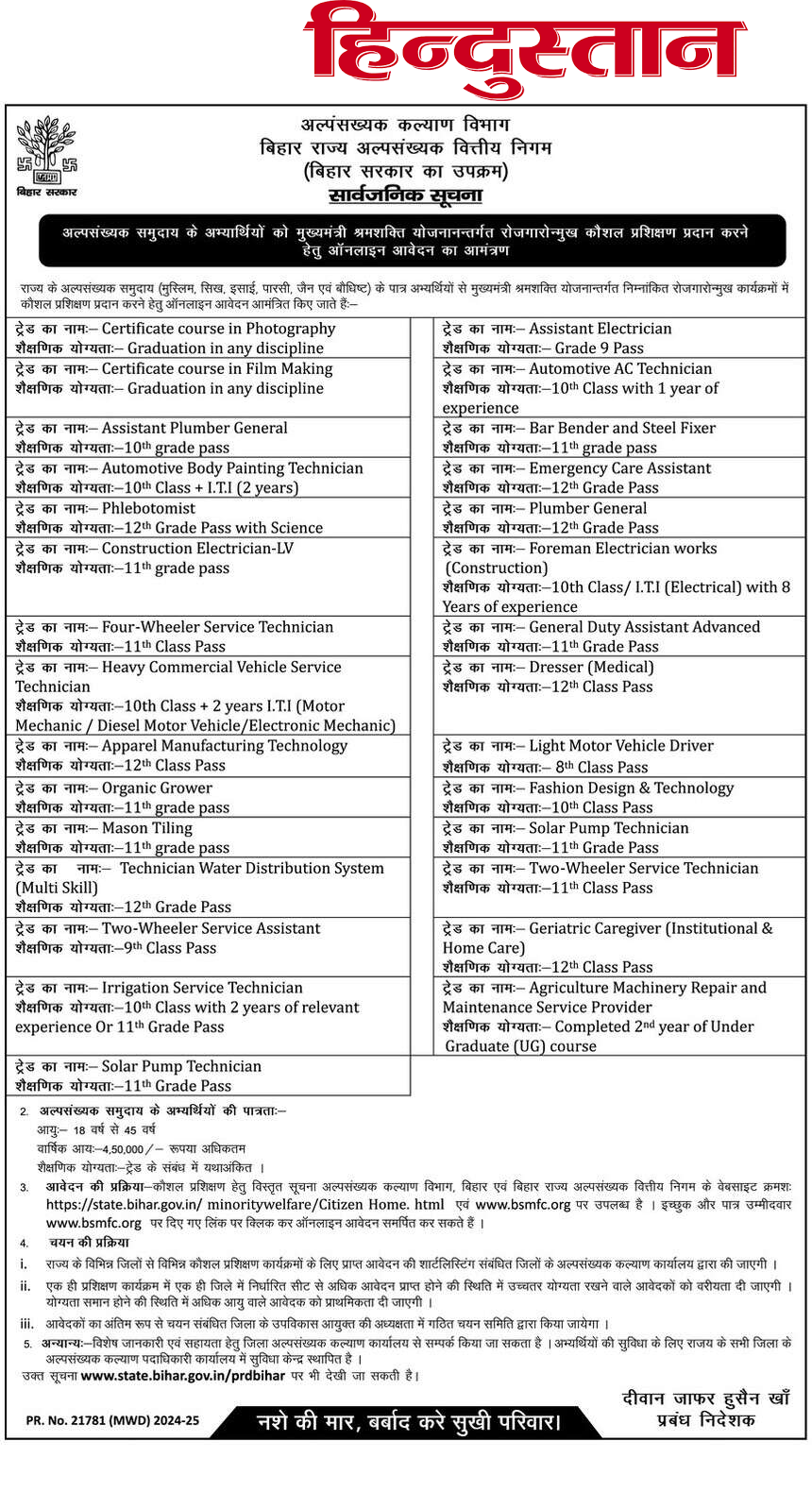 अपने इस आर्टिकल मे हम, आप सभी युवाओं का हार्दिक स्वागत करना चाहते जो कि, बिहार के रहने वाले है अलग – अलग फील्ड की बिलकुल फ्री स्किल ट्रैनिंग प्राप्त करना चाहते है और इसीलिए हम, आपको इस आर्टिकल मे विस्तार से अल्पसंख्यक कल्याण विभाग, बिहार सरकार द्धारा जारी Mukhyamantri Shram Shakti Yojana Bihar Online Apply 2025 के बारे मे बताना चाहते है जिसकी पूरी – पूरी जानकारी प्राप्त करने के लिए आपको ध्यानपूर्वक इस आर्टिकल को पढ़ना होगा।