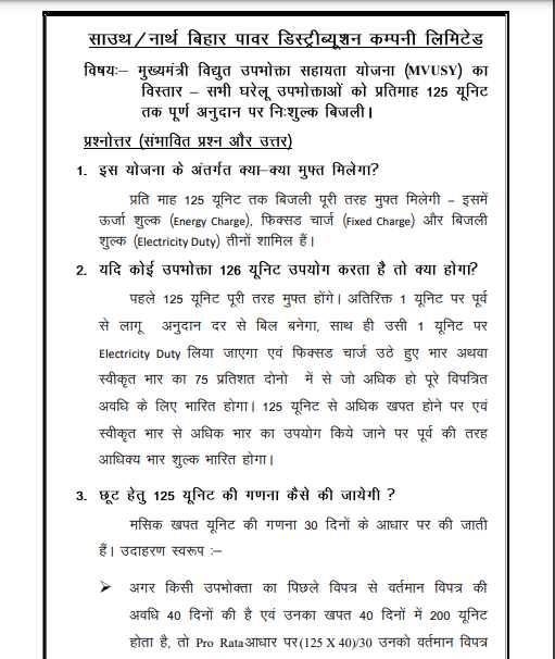 अब यहां पर आपको कुछ बिंदुओं की मदद से बताना चाहते है कि, ” बिहार मुख्यमंत्री विद्युत उपभोक्ता सहायता योजना ” के तहत आपको क्या – क्या फ्री मिलेगा तो आपको बता दें कि, इस योजना के तहत आपको प्रतिमाह अर्थात् हर महिने पूरे 125 यूनिट बिजली बिलकुल फ्री प्रदान की जाएगी जिसमे ऊर्जा शुल्क / Energy Charge, Fixed Charge और बिजली शुल्क / Electricity Duty शामिल होगा आदि।
