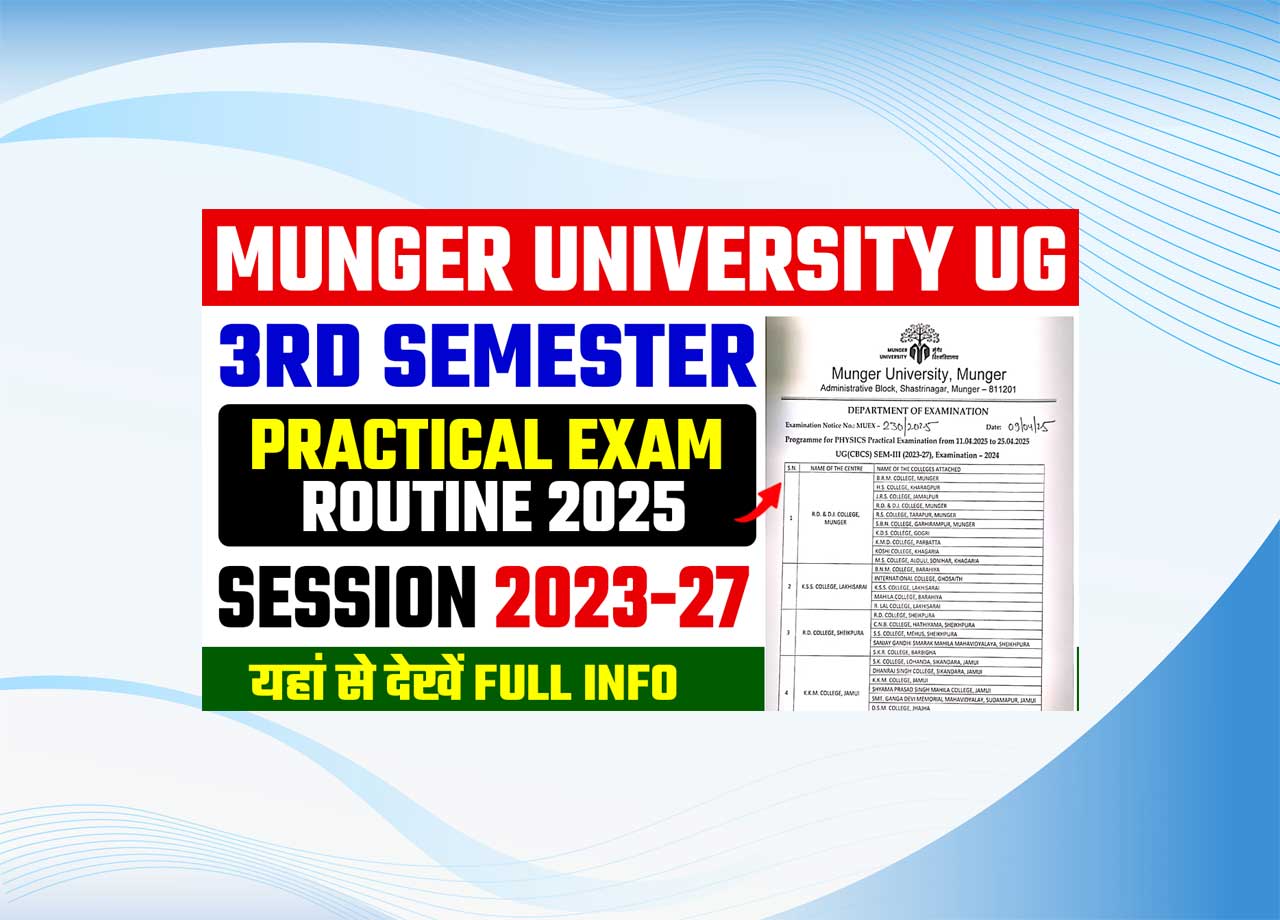 | Name Of The Article | Munger University UG 3rd Semester Practical Exam Routine 2025 (Session 2023-27): एमयू तृतीय सेमेस्टर प्रायोगिक परीक्षा का रूटीन तथा सेंटर लिस्ट हुआ जारी, यहां से देखें Full Info. |