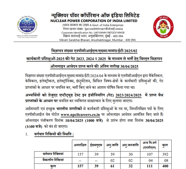 आपको बता दें कि, NPCIL Executive Trainees Recruitment 2025 के तहत रिक्त कुल 400 पदों पर भर्तियां की जायेगी जिसके लिए आप सभी युवा 10 अप्रैल, 2025 से आवेदन प्रक्रिया को शुरु किया गया है जिसमे आप सभी अभ्यर्थी आगामी 30 अप्रैल, 2025 की शाम 4 बजे तक अप्लाई कर सकते है और इसमे करियर बनाने का सुनहरा अवसर प्राप्त कर सकते है तथा